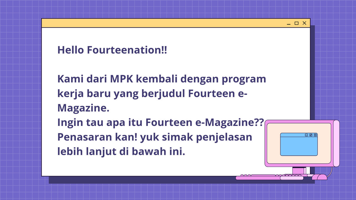 Kami dari MPK kembali lagi dengan program kerja baru yang berjudul "Fourteen e-Magazine"